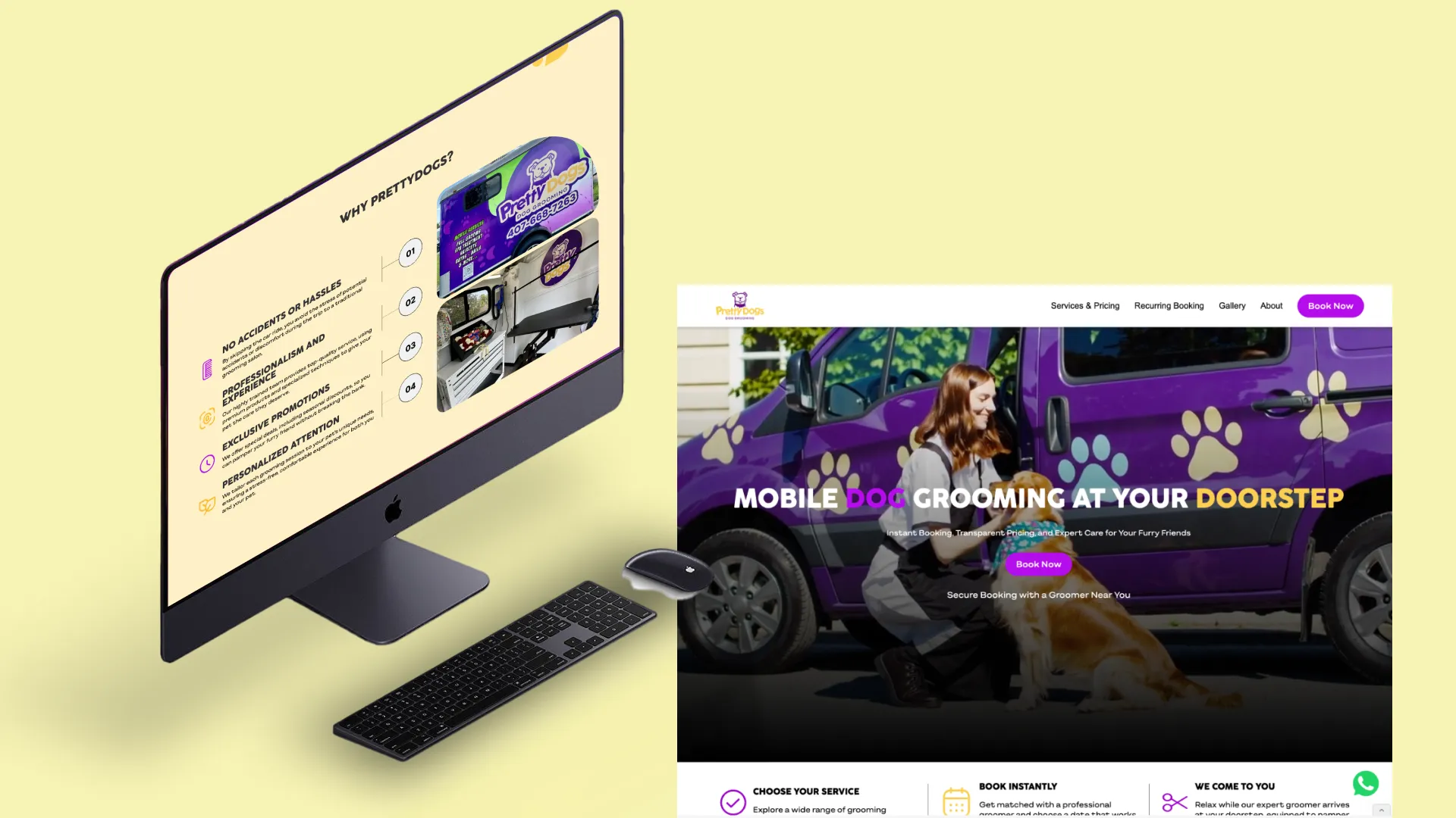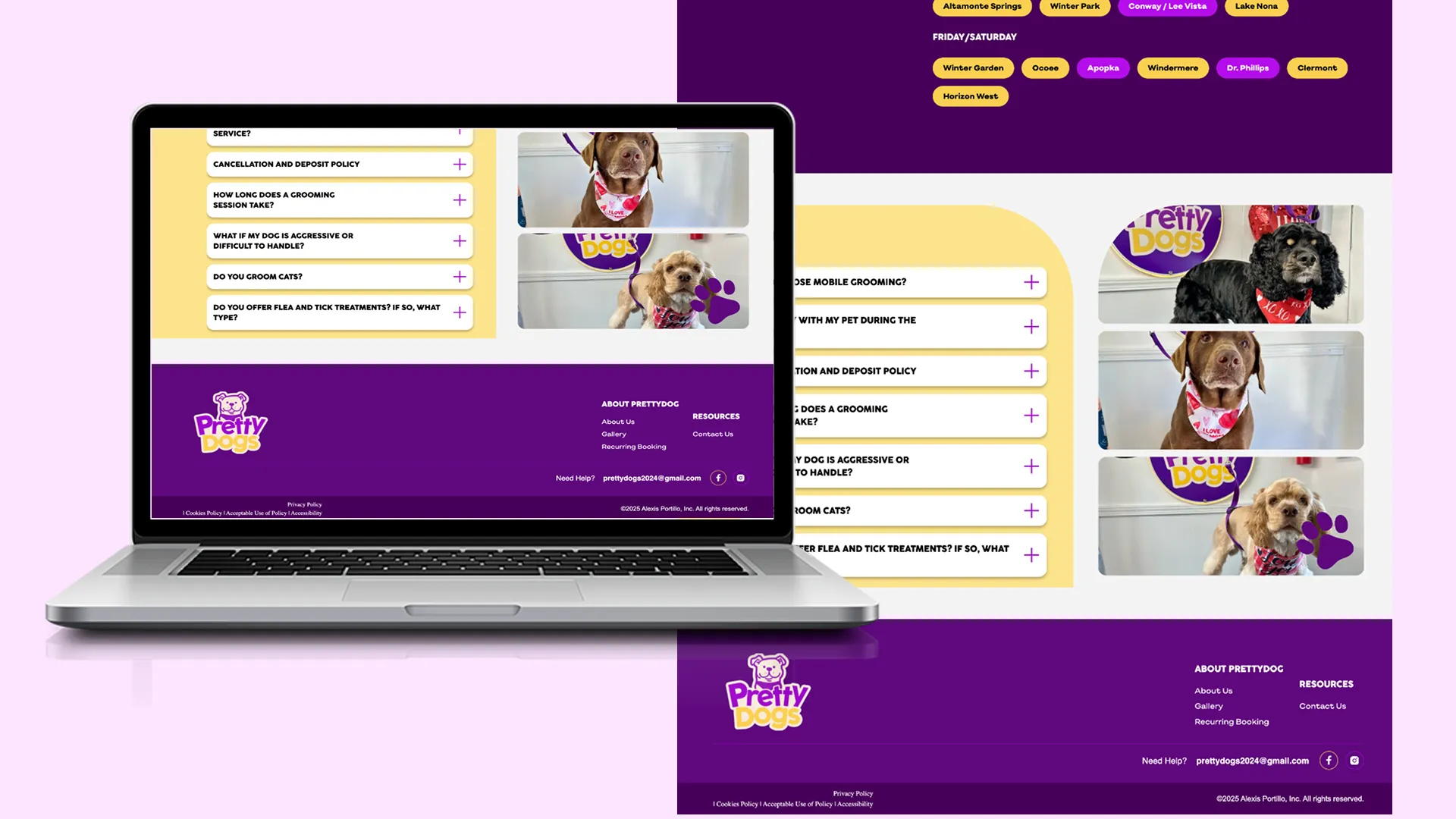 A modern, high-converting website that positions Pretty Dogs as Orlando's premier mobile pet grooming service. The site effectively communicates the convenience and care advantages of mobile grooming while streamlining the booking process, turning website visitors into satisfied customers.